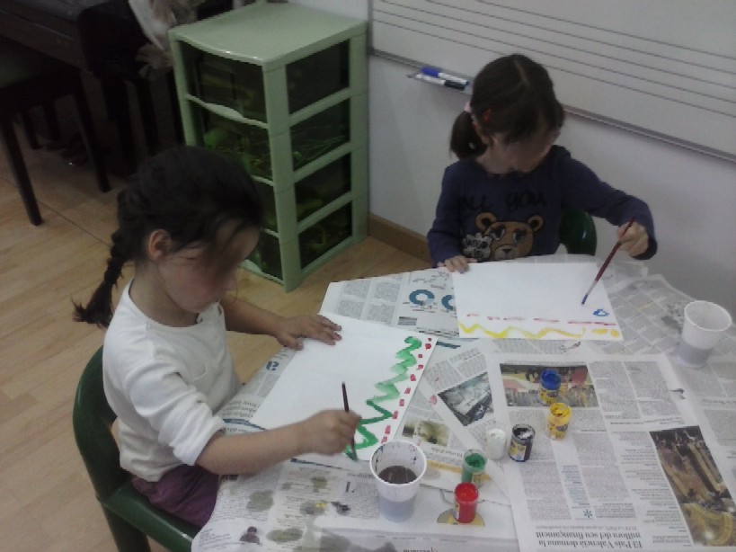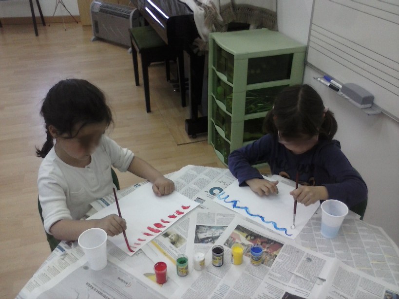 És curiós perquè al principi, la majoria pintaven tranquil.lament, amb traç tranquil, tot i que la música era més enèrgica (marxa militar!)... Jo crec que el sol fet d'escoltar la música en silenci ja els feia estar relaxats/des, i al ser una novetat tampoc sabien al començament com deixar-se anar. Però, mica en mica, ja veies que a mesura que anaven escoltant concentrats/des, alguns/nes es deixaven anar més, i potser representaven amb punts o ratlles els models més rítmics que escoltaven o amb moviments de braç més ràpid o lent.